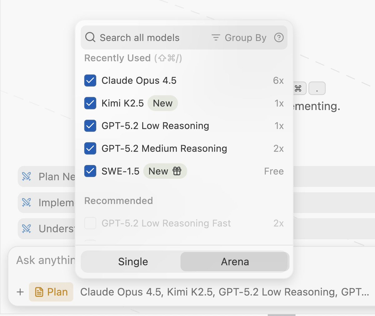 @windsurf製品·2026年1月31日Windsurf、アリーナモードを公開:来週はトップAIモデルとの無料バトルWindsurfはアリーナモードを導入し、ユーザーが最大5つのAIモデルを選択して直接比較可能で、選択モデルに応じてクレジットが消費されます。来週1週間はバトルグループを選択することで無料アクセスでき、フロンティアグループにはOpus 4.5、GPT-5.2-Codex、Kimi K2.5が含まれます。
