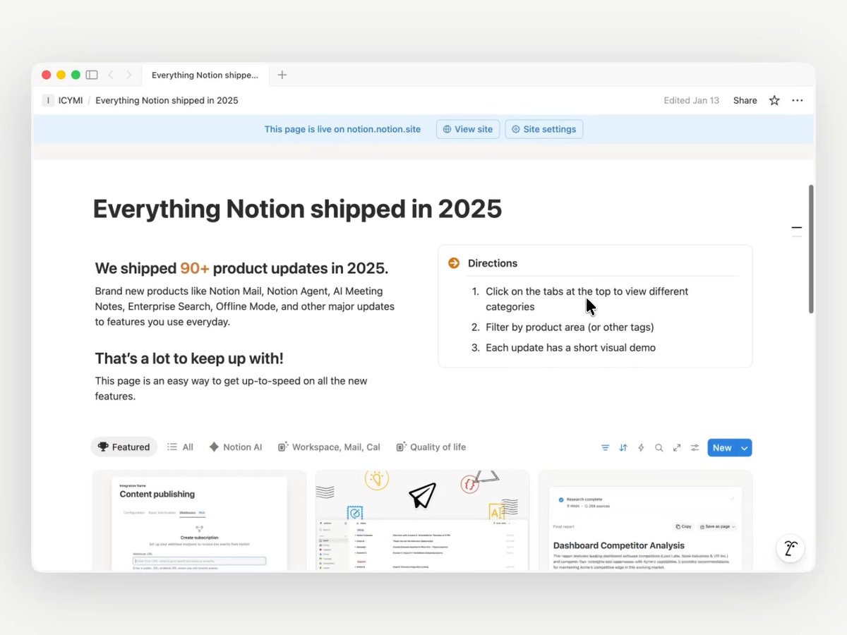 @NotionHQ製品·2026年1月27日Notion、2025年に90超の製品アップデートをリリース リキャップページを公開Notionは2025年に90以上の製品アップデートを実施したと発表した。主要機能の追加から細かな改善までを含み、すべてのアップデートを閲覧できる専用ページを公開した。